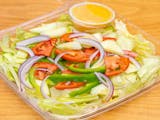 Lettuce, tomato, onions, cucumber, olives, feta cheese, Greek dressing.